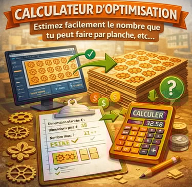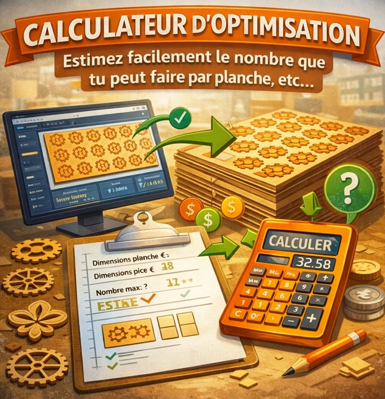 BoujouArt met à votre disposition des calculateurs simples et efficaces pour vous aider à maîtriser vos coûts, optimiser vos plaques et estimer précisément votre temps machine. Que vous découpiez, graviez ou prépariez une nouvelle collection, nos outils vous accompagnent pas à pas pour fixer vos prix de vente, réduire vos pertes matière et gagner du temps dans vos projets artisanaux.